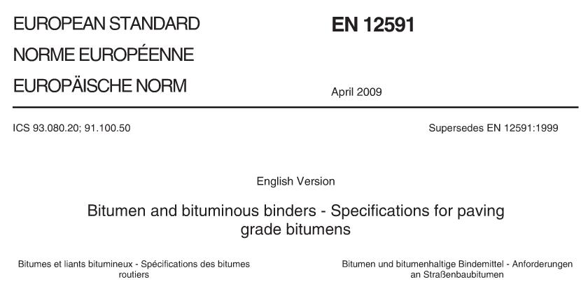EN 12591-the European Standard provides a framework for specifying a range of properties and relevant test methods for bitumens, which are suitable for use in the construction and maintenance of roads, airfields and other paved area, together with requirements for evaluation of conformity.
